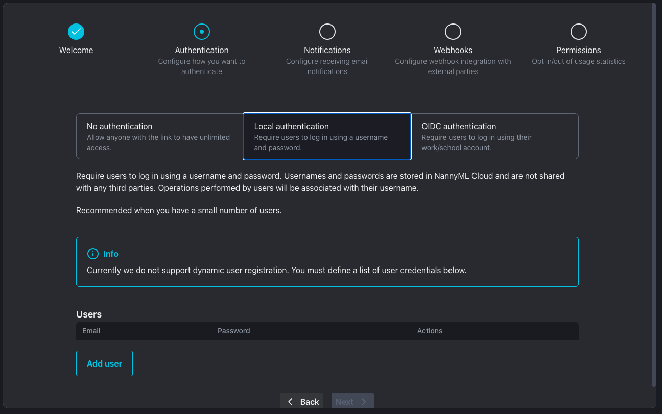 By choosing local authentication you can define a list of users who can access NannyML cloud. Each user requires an email, and a password. After creating a user, it is possible to delete them, but it is not possible to update the user information. This means updating the user password requires deleting and re-creating the user.