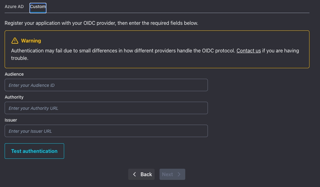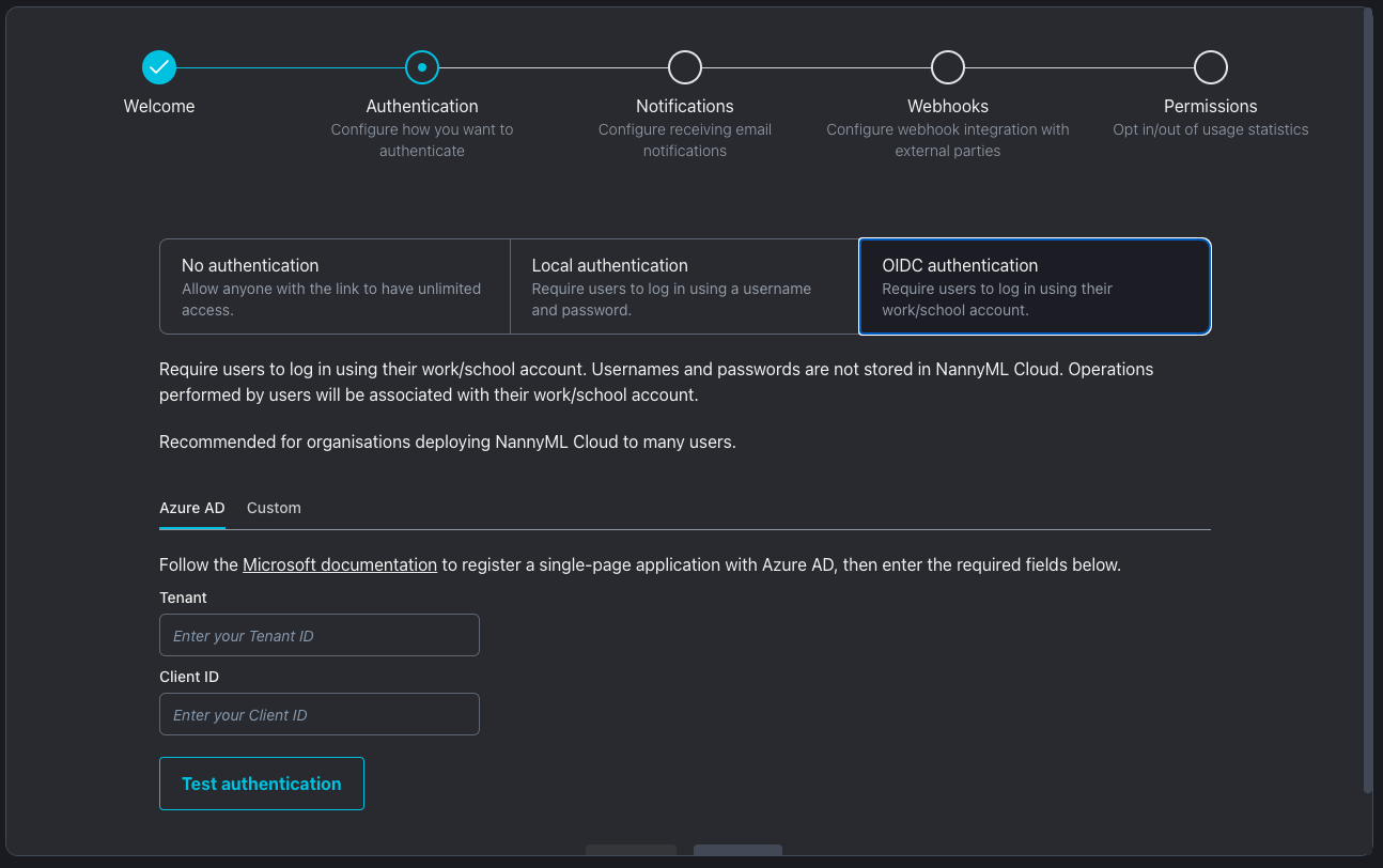 By choosing OIDC authentication, you can add your authentication provider to authorize your users to access NannyML Cloud. You can use built in Azure AD or register your OIDC provider.