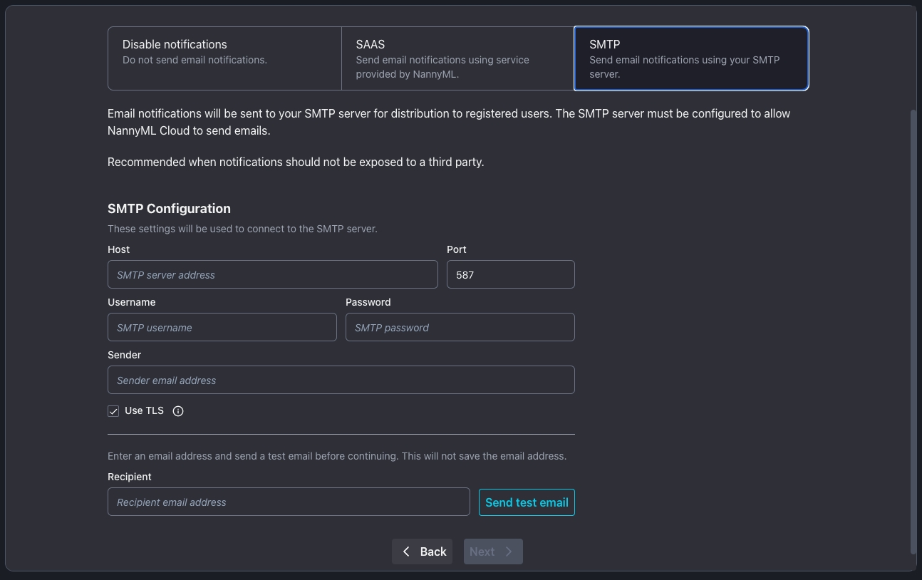 The SAAS option enables NannyML Cloud's preconfigured email provider. No further configuration is required.
