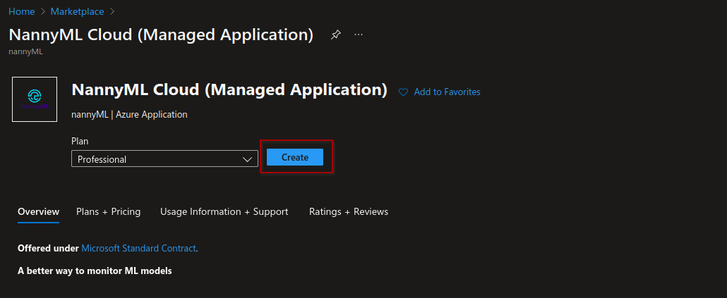 4. Review the product and pricing information. Note that we currently only offer the NannyML Cloud managed application with a *Professional* plan.\