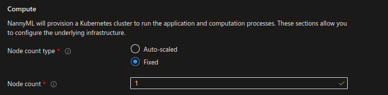 1. **Subscription**: use the dropdown box to select an eligible subscription. The NannyML managed application will be billed using the billing methods associated with this subscription.