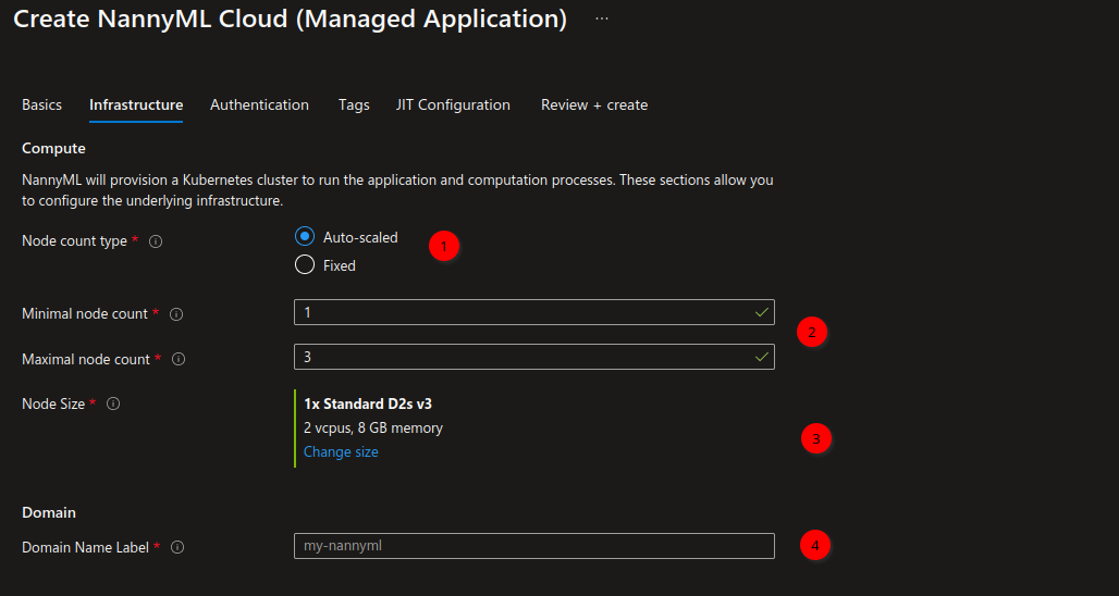 4. **Domain name label**: provide a label used to expose your application. NannyML will be available at the following URL after provisioning completes: `https://<domain-name-label>.<region>.cloudapp.azure.com`.  A full example would be `https://nannyml-managed.westeurope.cloudapp.com`.