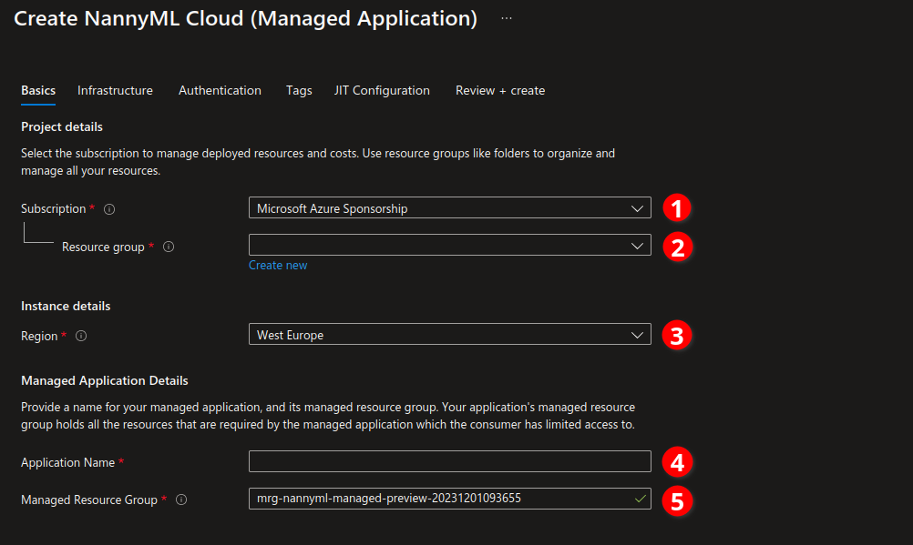 2. **Resource group**: select an existing or create a new resource group to house the managed application resource. The managed application itself will create two more resource groups to house the internal infrastructure. See the [engineering](https://docs.nannyml.com/cloud/v0.24.1/miscellaneous/engineering "mention") page for more details.