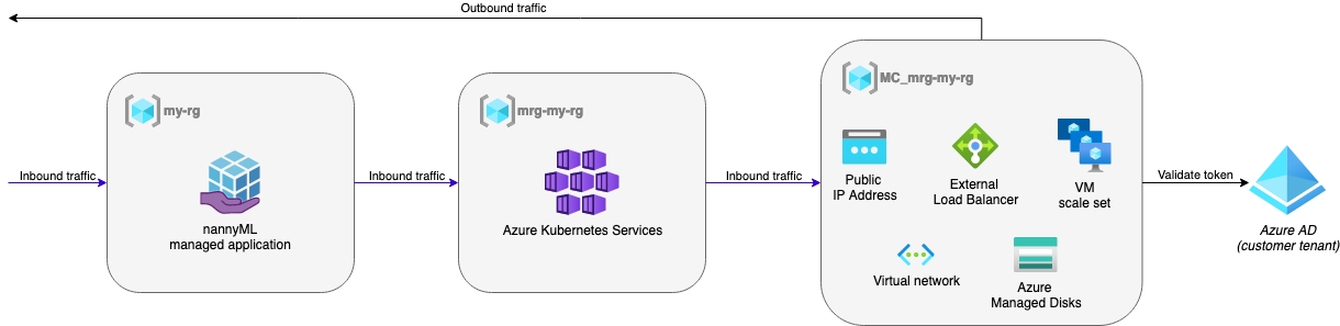 • Network traffic is routed through an Azure Load Balancer (ALB). The ALB instance has a dynamic public IP assigned to it. It is also exposed using a prefix of your choosing as <dns-prefix>.<location>.cloudapp.azure.com, e.g. my-nannyml.westeurope.cloudapp.azure.com.