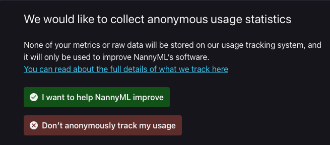 The first time you visit your NannyML Cloud instance, you will get prompted with the following message about anonymous usage statistics.