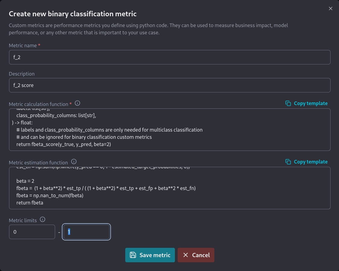 The default metric limits still apply, so we can leave those as they are. These metric limits ensure that the metric thresholds are constrained to these theoretical limits. We then fill all this information on the new binary classification metric screen: