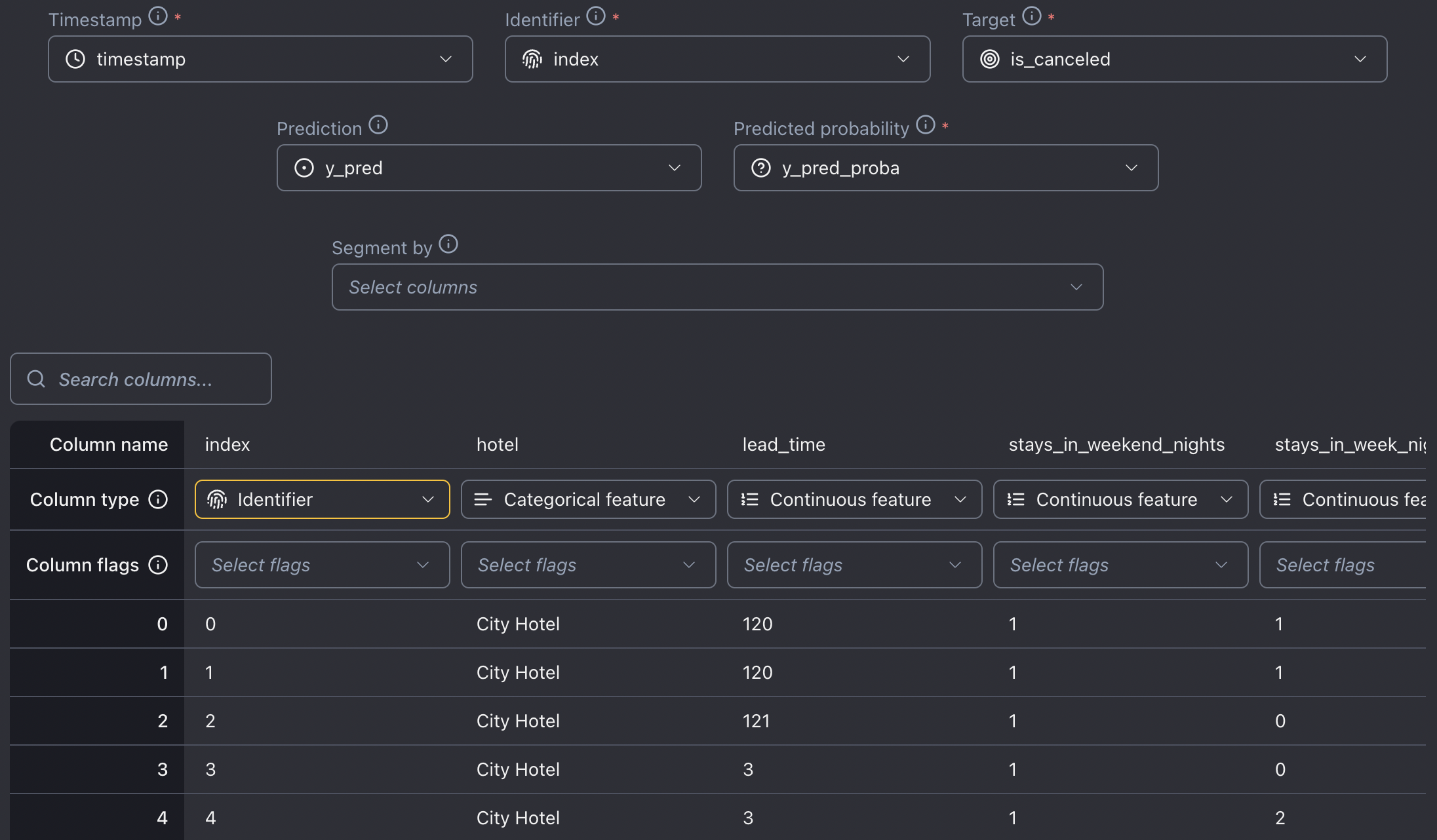 Optionally indicate the columns you wish to use for segmentation. This can be done by selecting specific columns using the **Segment by** dropdown menu or by selecting the **Segment by** flag for specific columns.