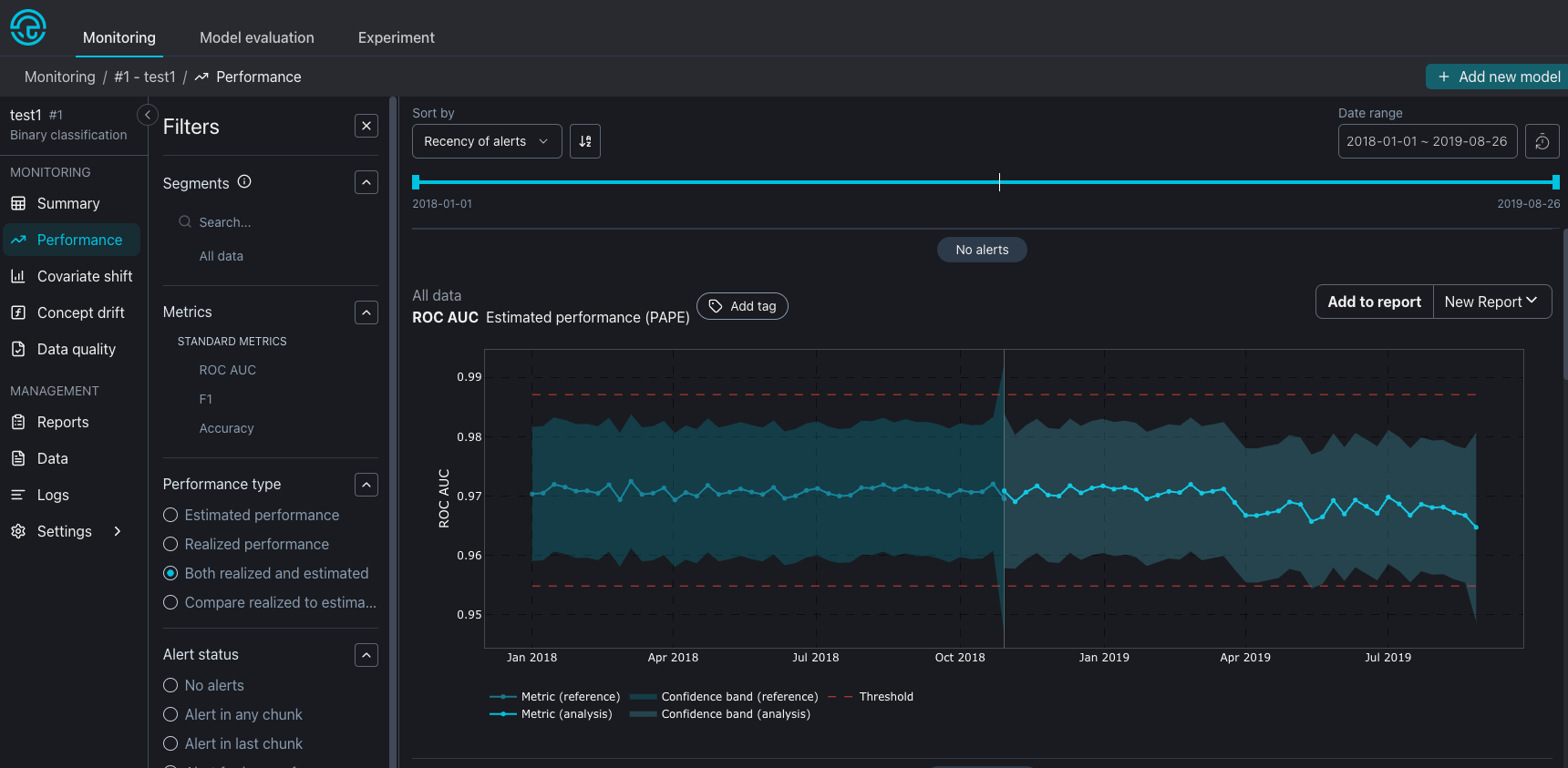 The user, when checking the model's state on the Monitoring page, can add plots to reports directly from the monitoring page.