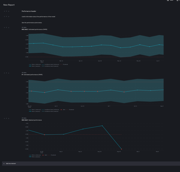Every time a new element is added to the report, moved or deleted, the report is automatically saved. The auto save happens also when the text element is changed. The only action that does not triggers an auto save event is zooming on the pots. To persist changes made on the plot, like zooming, the user needs to click on the 'Save' button on the top right corner of the screen.