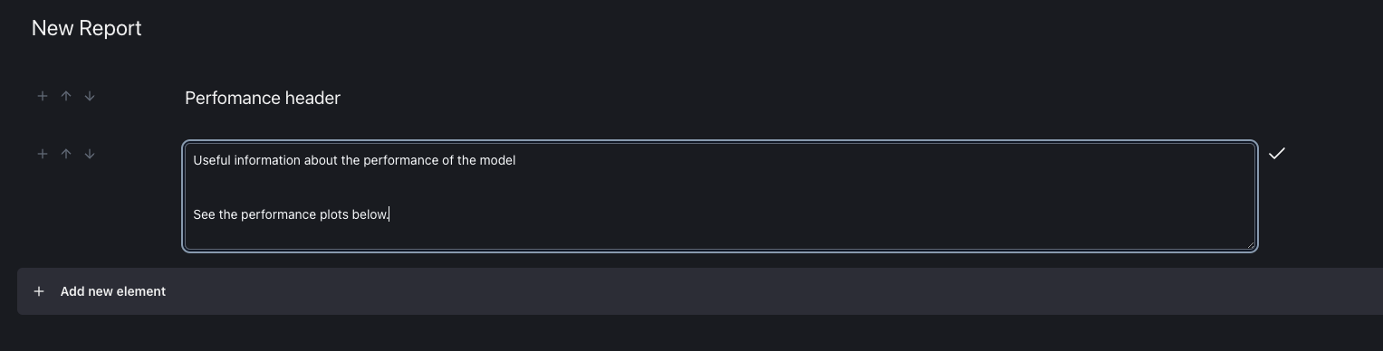 By selecting a Section Header or a Text, the new element will appear above the 'Add new element' line. By selecting a Plot Option, a new window will appear for the user to select plots.