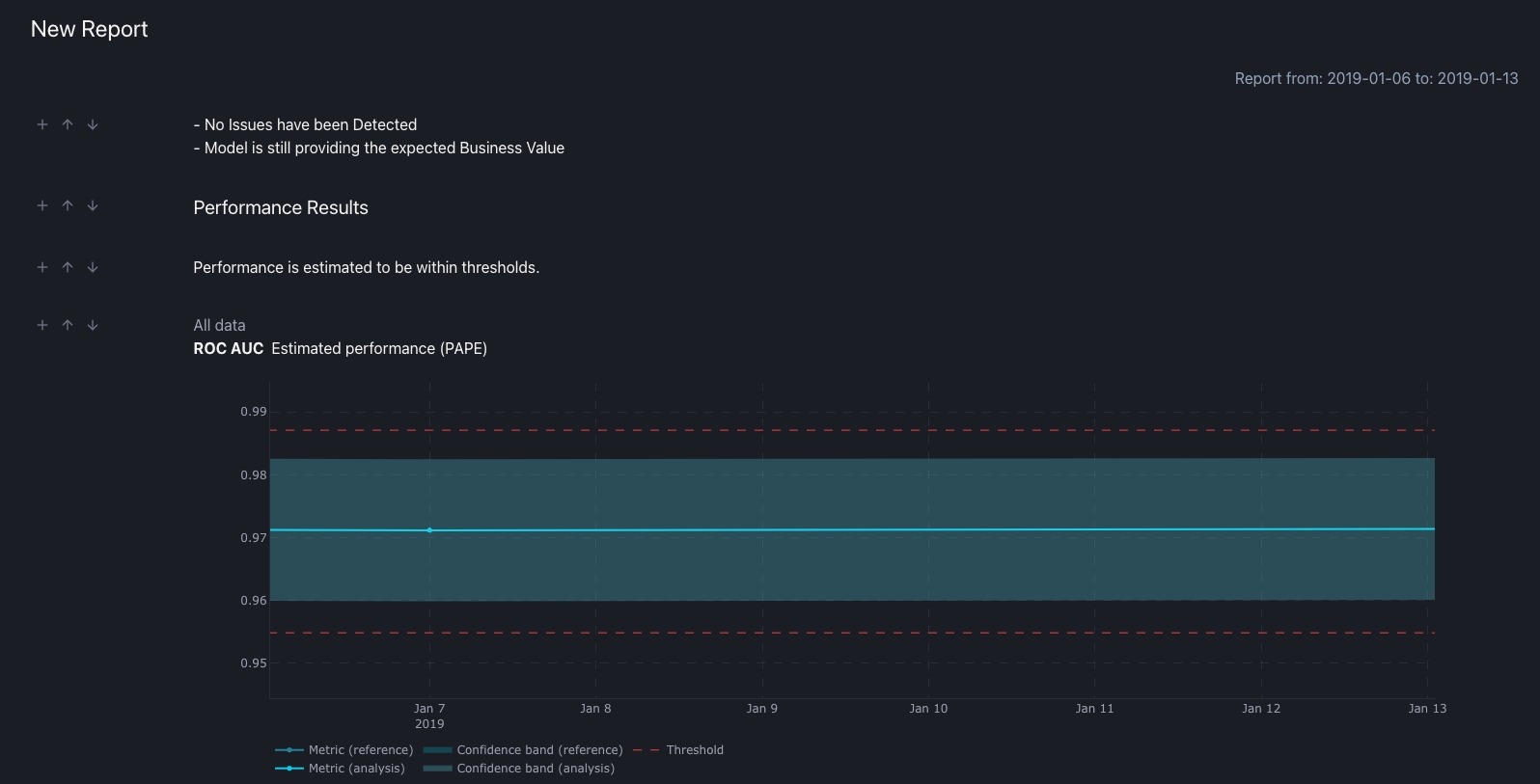 The auto generated performance template will look like this if the model's data set presents no alerts during the selected date range: