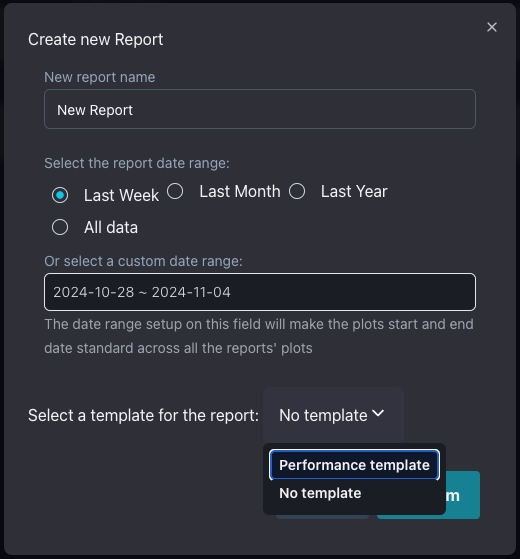 The template report will generate some standard text related to the model's state during the selected date range. Copying a report will replicate the plots and the text information of the original report.
