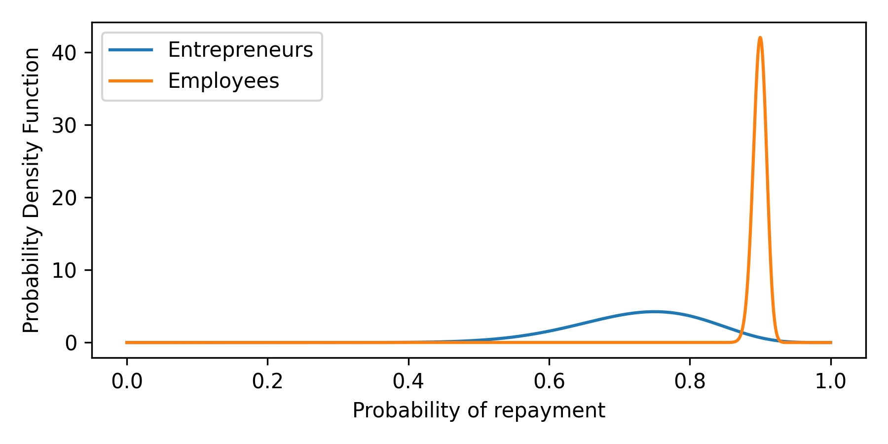 Figure 2. Distribution of population probability of repaying the loan for the two types of applicants.