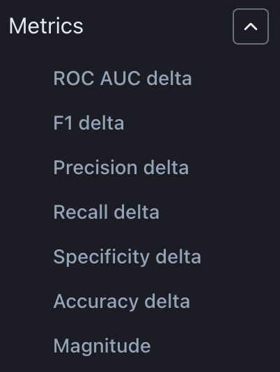 Select which metrics you want to have displayed on the performance impact graph. Additionally, a magnitude metric illustrates the magnitude of concept drift at specific periods.