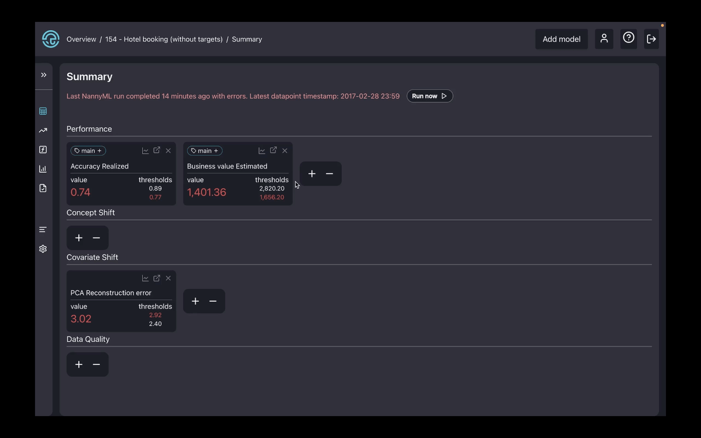 The first tab you can access in the side panel is the model summary page. It displays monitoring results for the most recent chunk for performance, concept shift, covariate shift, and data quality checks and notifies you whether there are any alerts.