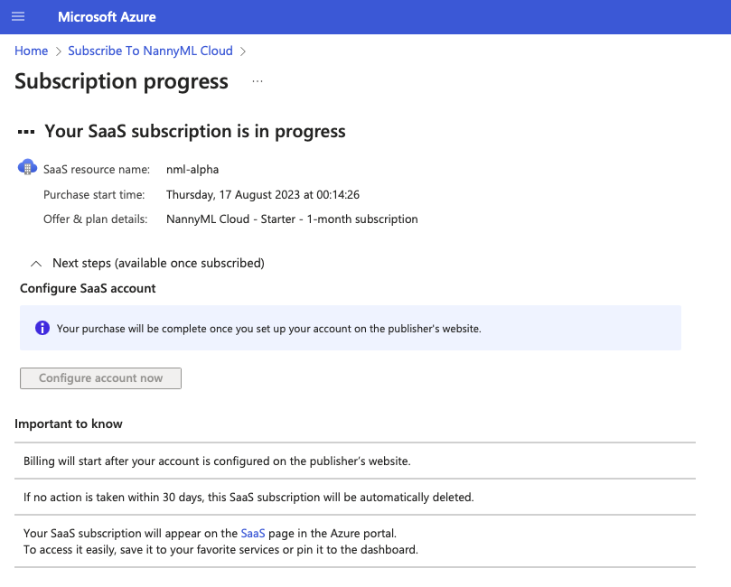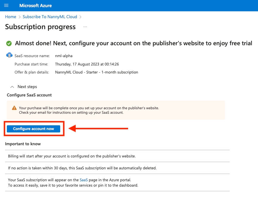 Once that's done, there is one thing left to do, which is to configure the NannyML SaaS account. Press "Configure account now":