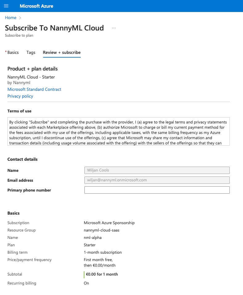 subscriptionSelect your Microsoft subscription and pick a resource group. If none are available create a new one. Be sure to provide a name for the NannyML SaaS subscription to easily identify it later: