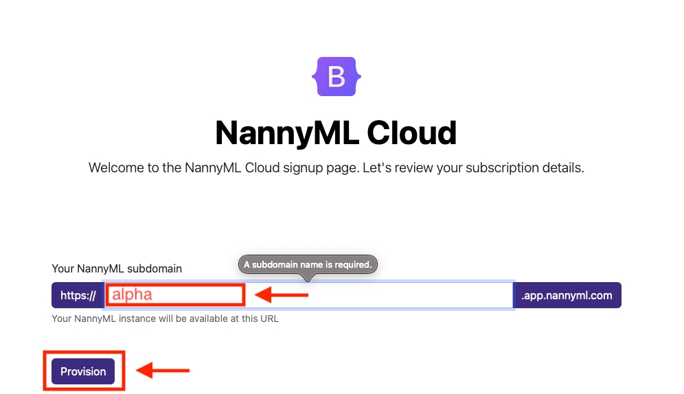 Provide a subdomain where you want the NannyML instance to be available and press "Provision":
