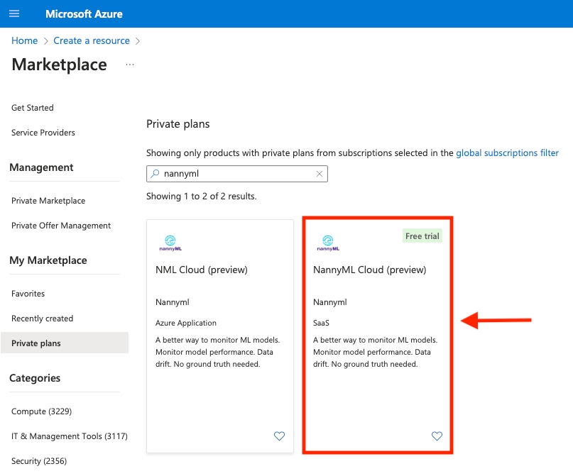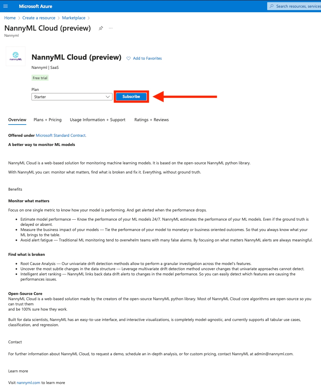 Click on the "NannyML Cloud (preview) SaaS" offering: