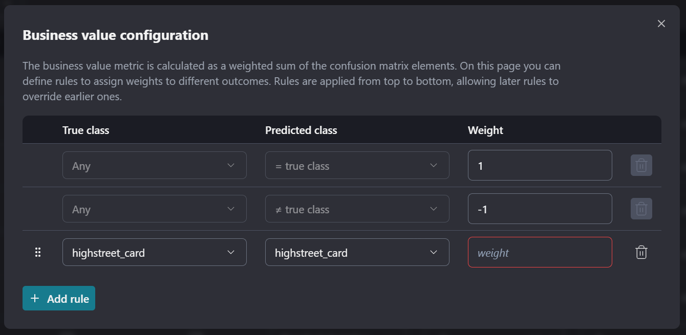 Once business value is enabled, configure rules to calculate business impact from the confusion matrix. Two default rules are in place to set a weight for correct and incorrect predictions. You can set values appropriate to your use case and add additional rules to set weights for specific outcomes.