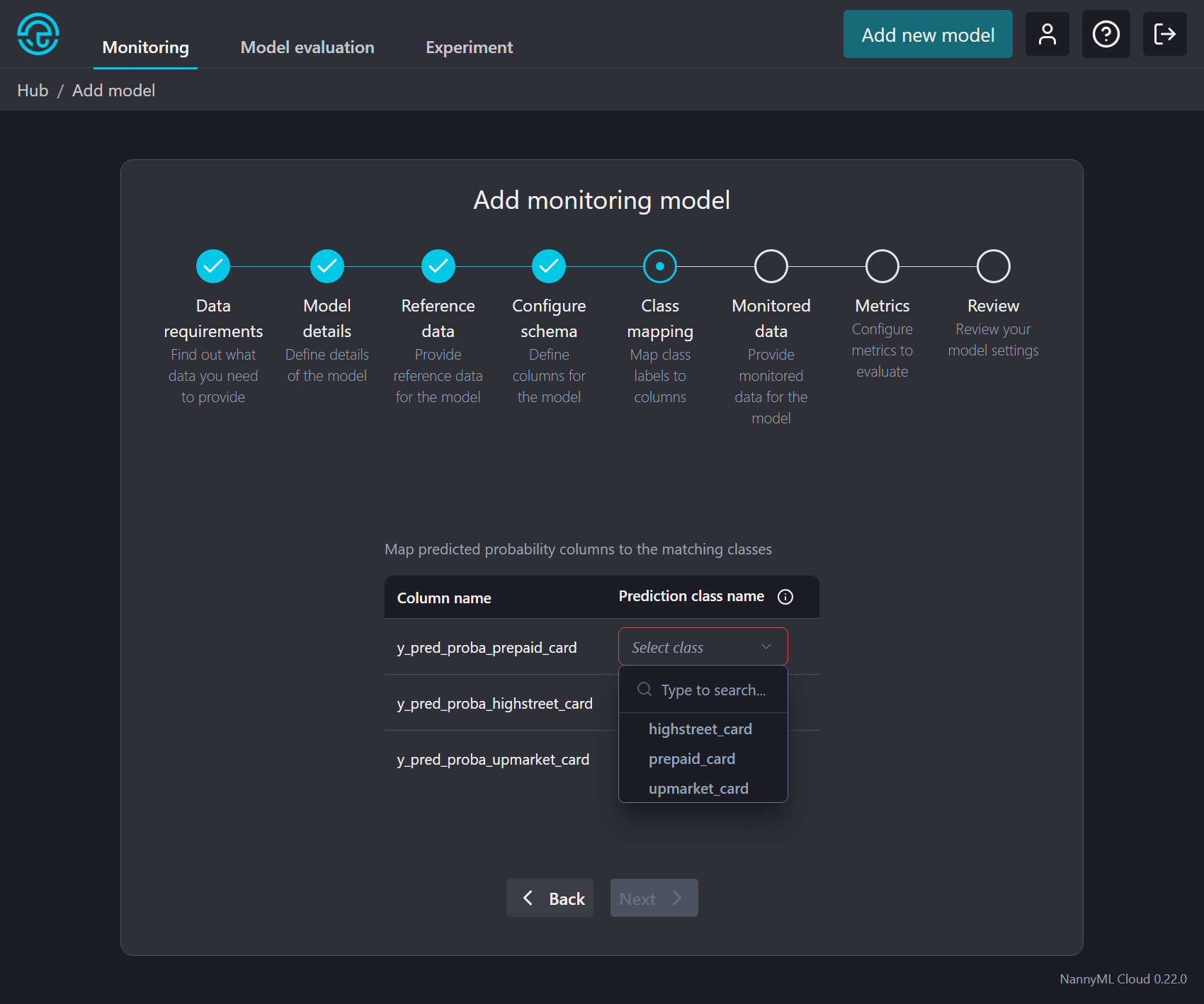We've changed this to a much easier to use dropdown menu. Behind the scenes we're collecting the available classes from the target column after you configure the schema. Depending on the dataset size, this can take a little time. Generally it should be pretty fast because we stop as soon as we find enough classes to match the number of predicted probability columns. But do make sure all classes are represented in your reference data, or you may be waiting a while 😅.