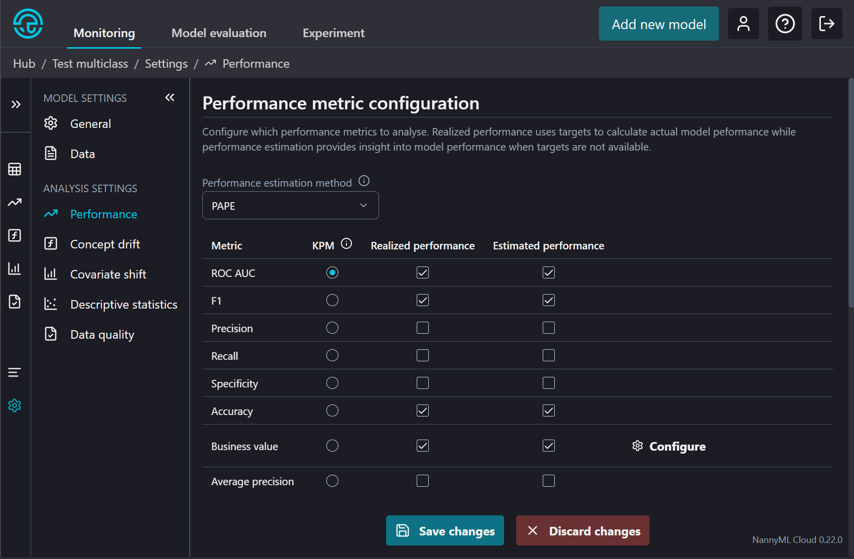 To enable business value for a new model, select the realized - or estimated performance options in the model creation wizard. For existing models, enable it on the model settings page.