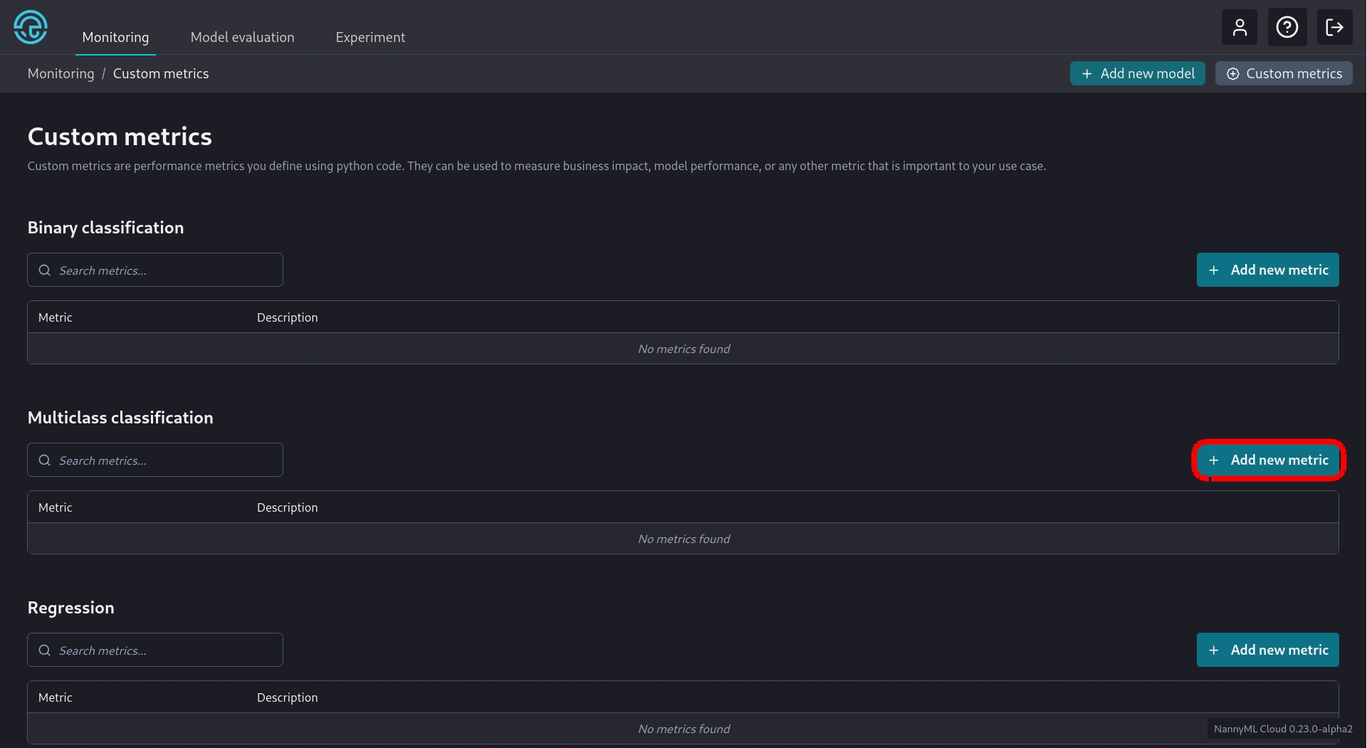 There are three types of custom metrics supported. Binary Classification, Multiclass Classification, and Regression. They are organized separately on the Custom Metrics settings page shown below: