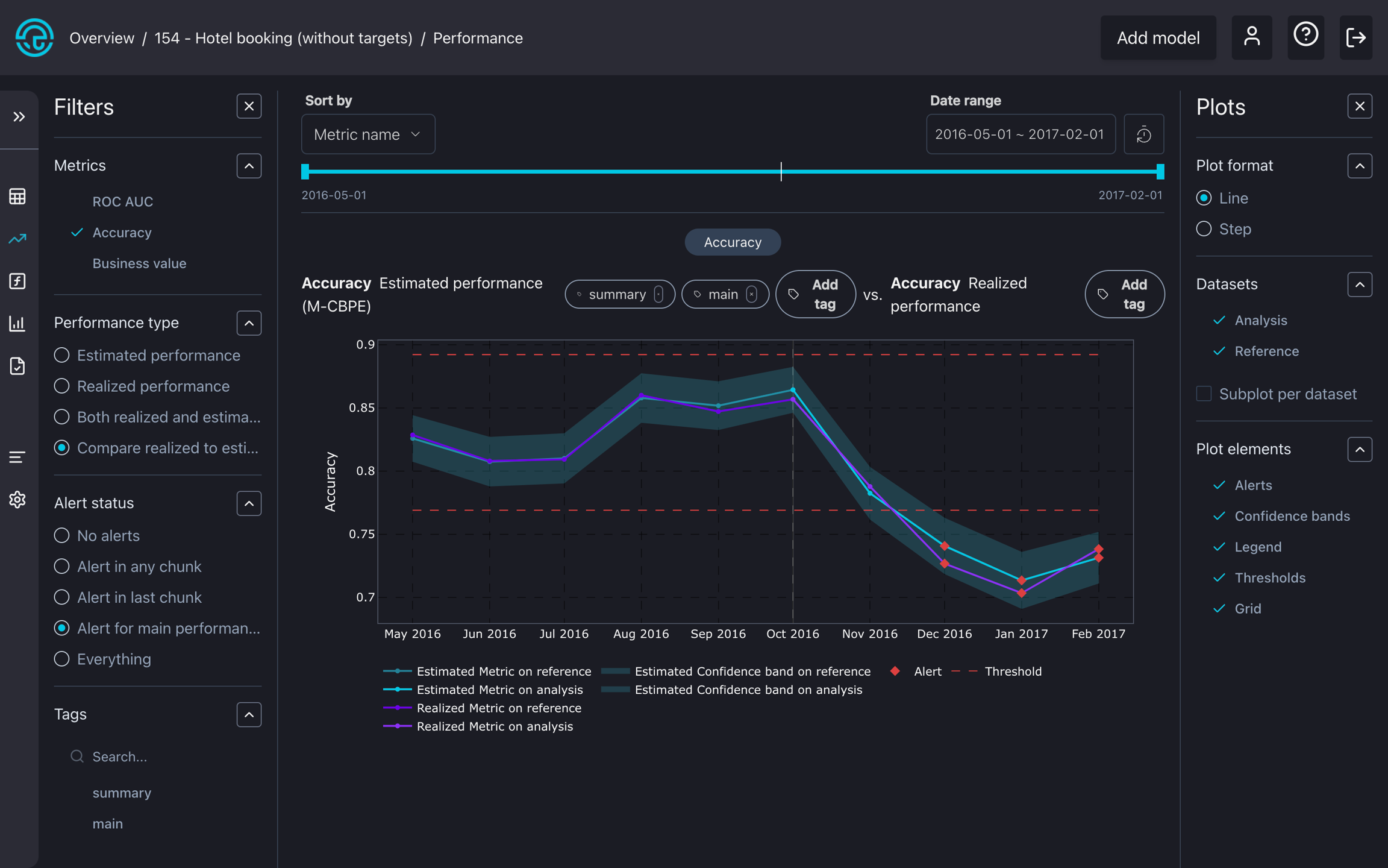 Then, we create a new model by using the Model.create() method. Where we can set chunk period to monthly, and accuracy as the main monitoring performance metric.