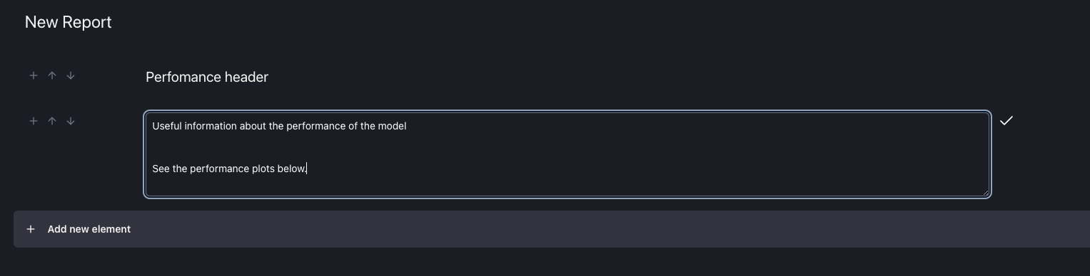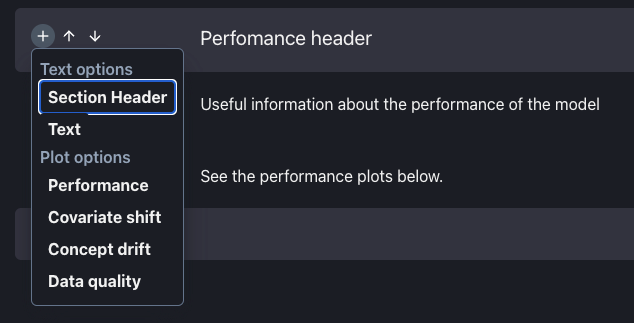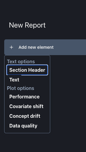 By selecting a Section Header or a Text, the new element will appear above the 'Add new element' line. By selecting a Plot Option, a new window will appear for the user to select plots.