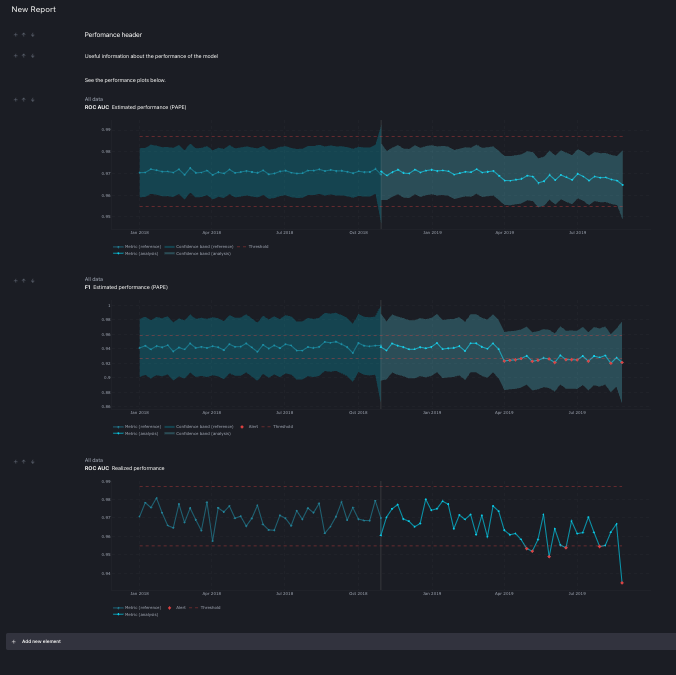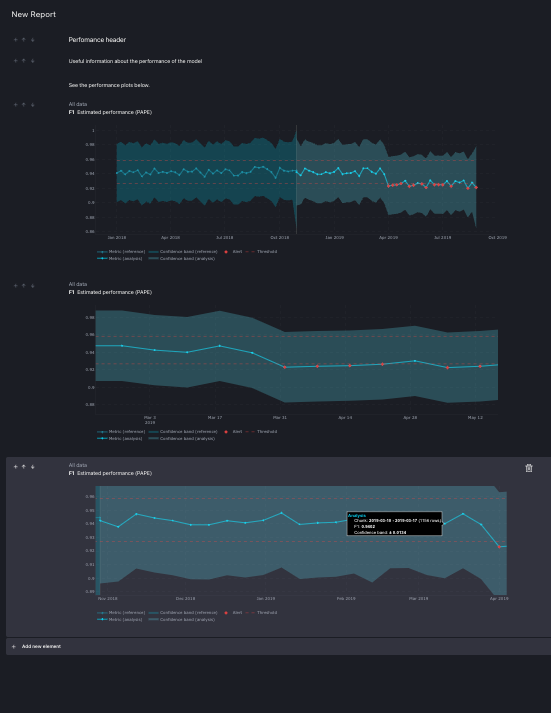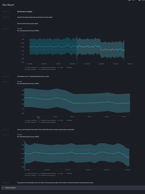 Every time a new element is added to the report, moved or deleted, the report is automatically saved. The auto save happens also when the text element is changed. The only action that does not triggers an auto save event is zooming on the pots. To persist changes made on the plot, like zooming, the user needs to click on the 'Save' button on the top right corner of the screen.