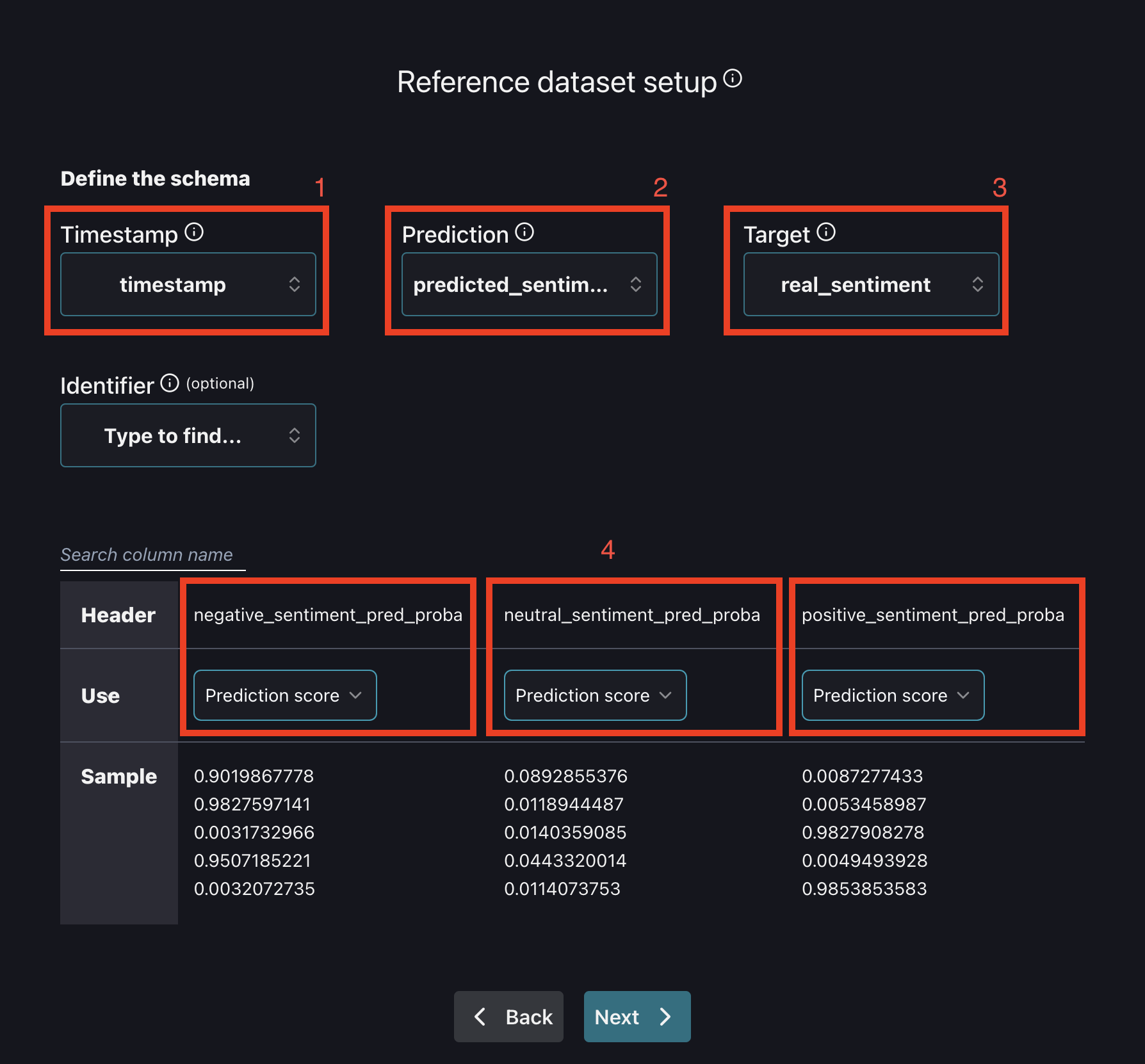 4. Flag the columns **negative\_sentiment\_pred\_proba, neutral\_sentiment\_pred\_proba, positive\_sentiment\_pred\_proba** as Prediction Scores.