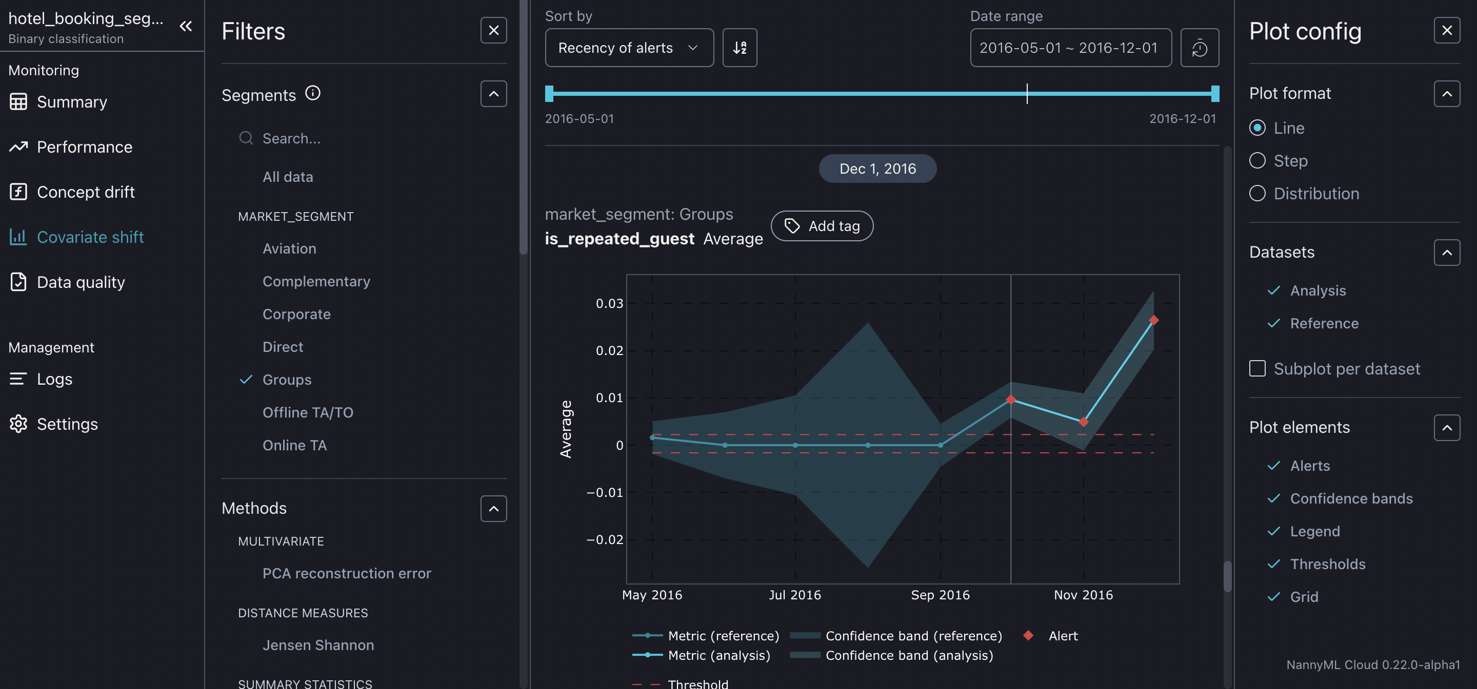 We can then proceed with conducting root cause analysis to understand the drop in performance. We do this by checking for covariate shifts in our data, focusing on the Groups segment. Indeed, we notice that various features have shifted in the group segment. This not only allows us to take the necessary steps to remedy the model but also offers more interpretability. For example, noticing that the repeated\_guests feature has drifted for the group segment can provide valuable information that data scientists can communicate to the upstream decision-making teams, offering insights into how many groups tend to return to a hotel.