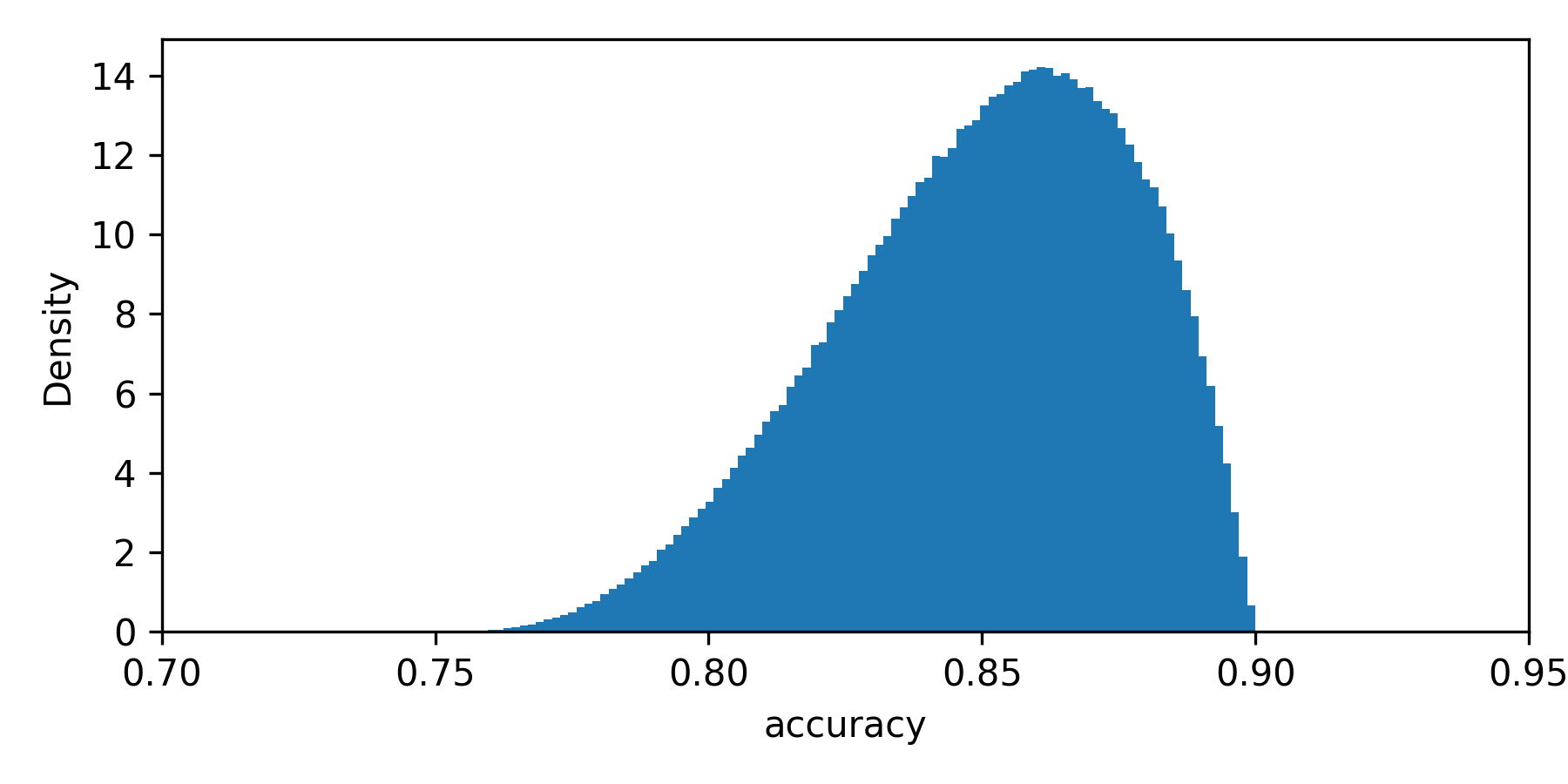 Let's get back to the case with two types of applicants. The population accuracy of the model depends directly on the proportion of entrepreneurs to those employed. However, there is uncertainty since we do not know the true population proportion value. We learn about this proportion as we observe more individuals applying for the loan. With this being a binary variable, we can also model it using the beta posterior. Assume that we observed five applicants, with 1 being an entrepreneur. The posterior probability of an applicant being an entrepreneur with a uniform prior is β(α=1+1,β=5−1+1). Now we sample from that posterior and calculate the accuracy. Say we have sampled the probability of an applicant being entrepreneur equal to 0.2. With perfectly calibrated probabilities, we can calculate the accuracy as 0.2 ×0.75 + (1-0.2) × 0.9 (that is: the probability of applicant being entrepreneur times the accuracy for entrepreneur plus the probability of applicant being employee times the accuracy for employee). This gives accuracy of 0.87. We do this multiple times and get the posterior sample of accuracy (shown as a density histogram on Figure 1).