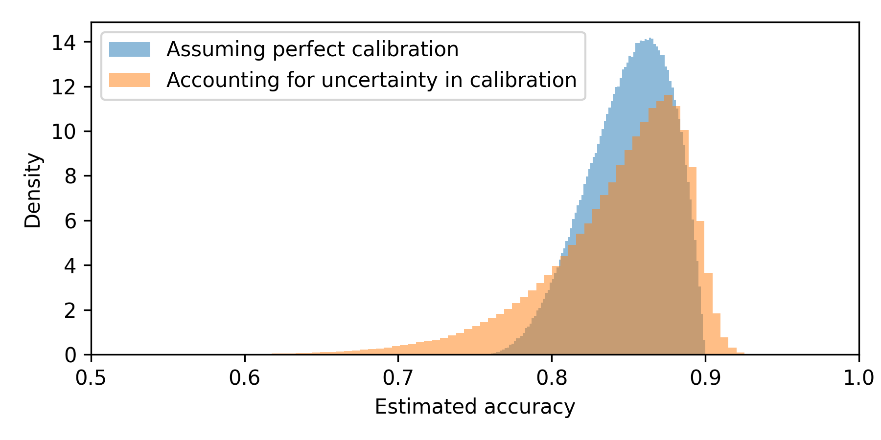 We again start the experiment and observe the same data as previously (5 applicants, with 1 being an entrepreneur). To get population-level accuracy distribution, we do the following: we sample from the applicant-being-entrepreneur probability distribution first (just like previously). Then, for the proportion sampled, we sample from posteriors of the true probabilities that the applicant will repay the loan given the applicant type and estimate accuracy for sampled numbers (using CBPE). Here is what we get compared to what we got previously (with perfect calibration assumption):