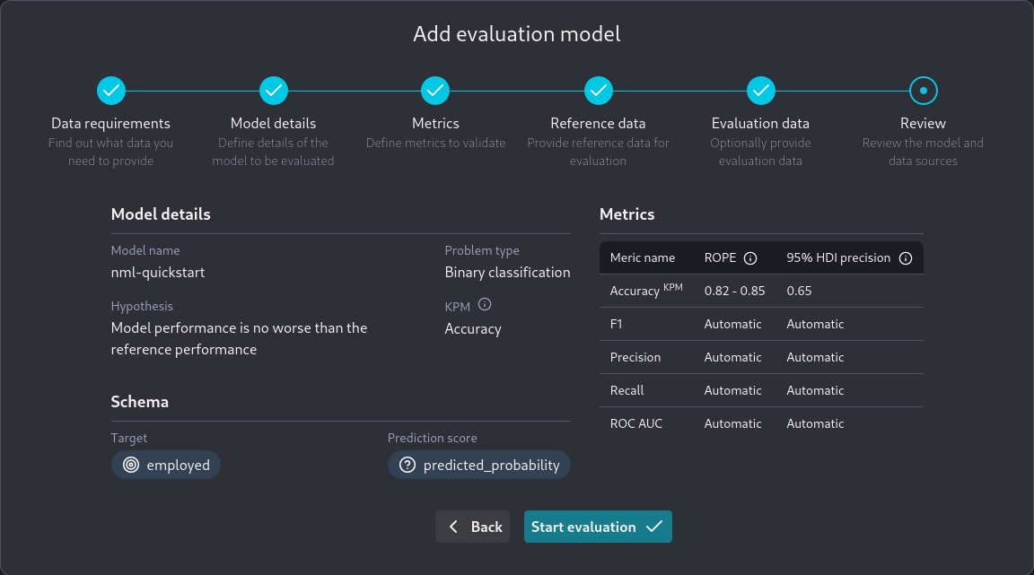 After providing the data we are again presented with a screen specifying their contents. Note that column names and data types cannot differ between reference and evaluation data.