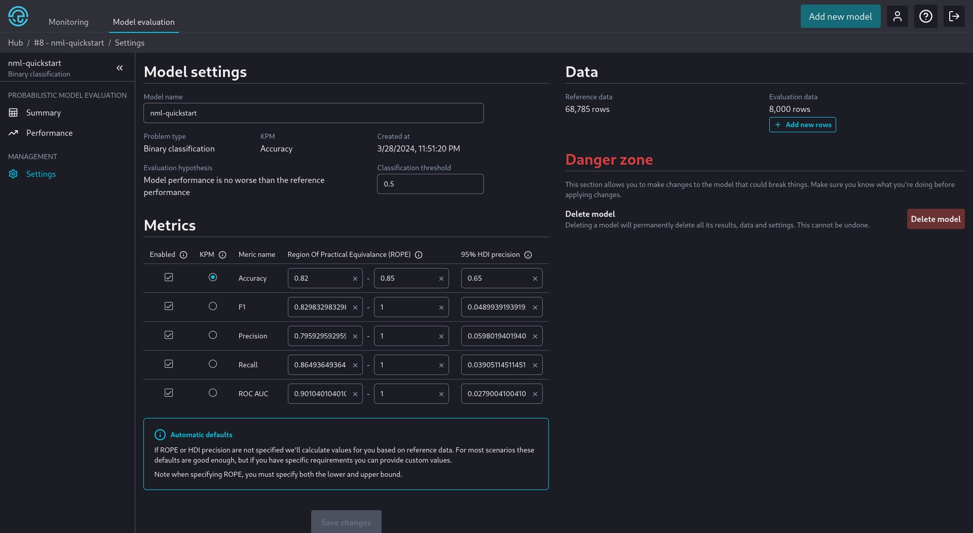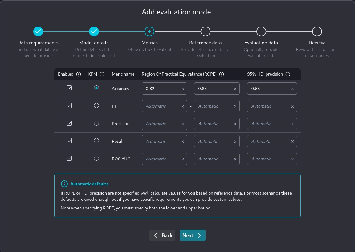 ROPE and the required 95% HDI precision for each metric can be manually specified or inferred from the model's behavior on the reference data.