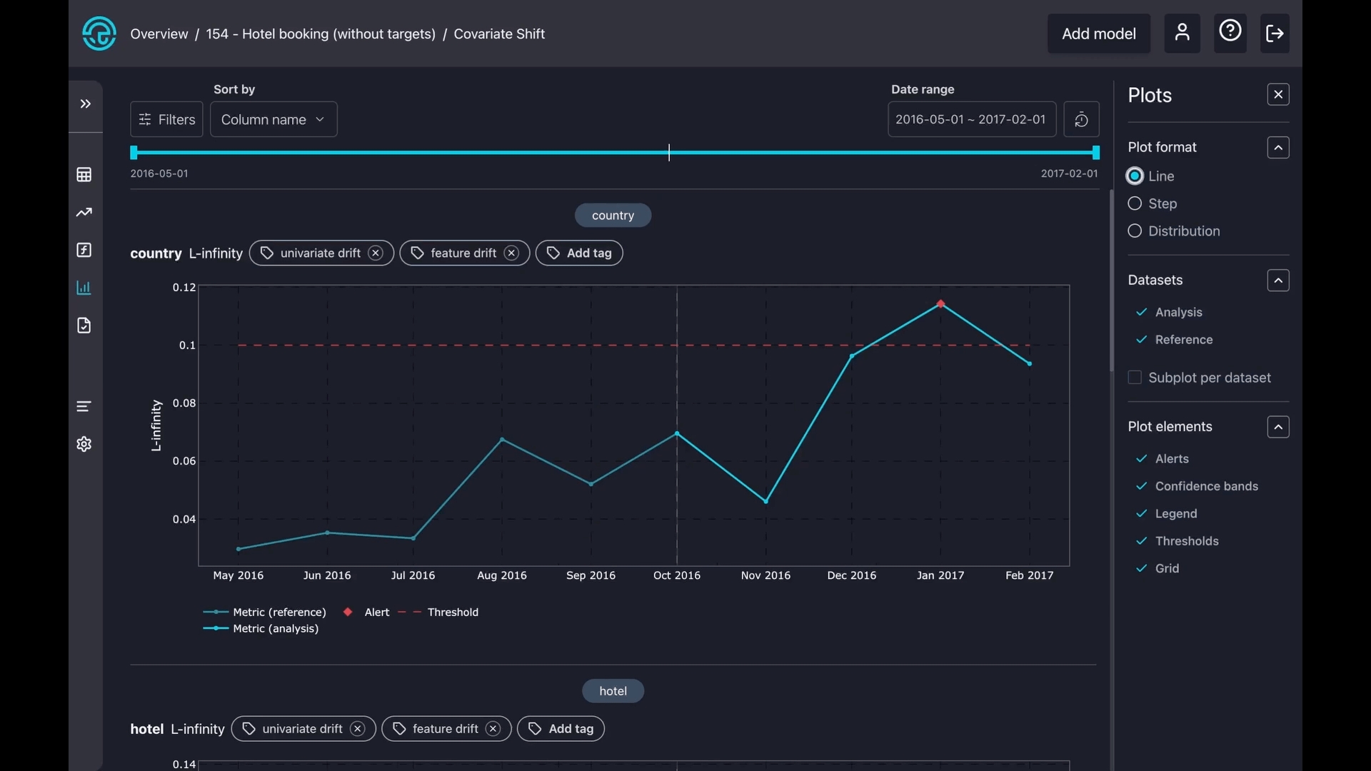 The charts are interactive, allowing you to hover over them for more details. Red dotted lines indicate the thresholds, while the blue line shows the metric during the reference period. The light blue line represents the metric during the analysis period.