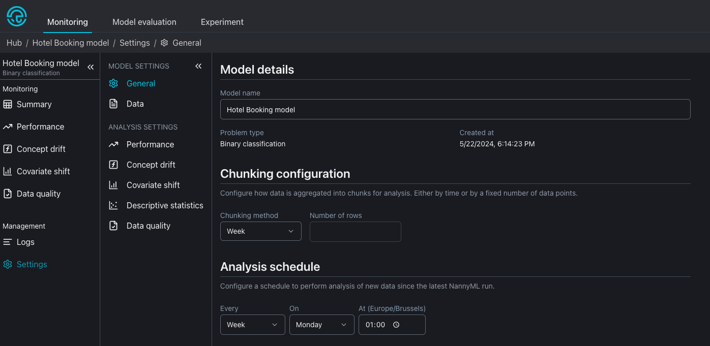 Under model settings, you can find all the monitoring parameters of a selected model. These settings are specific to a single model and are not confused with the general NannyML settings in the navbar.