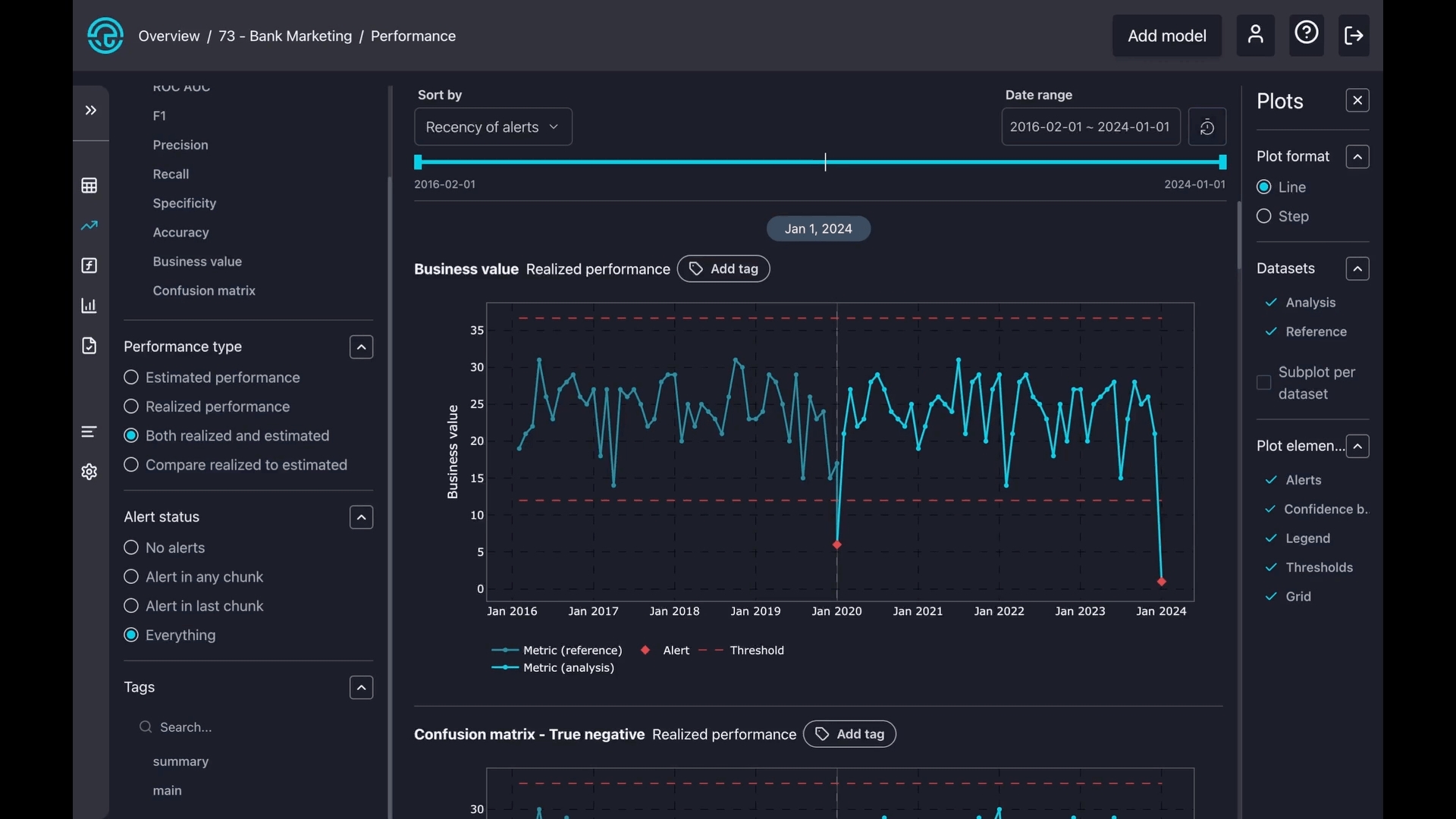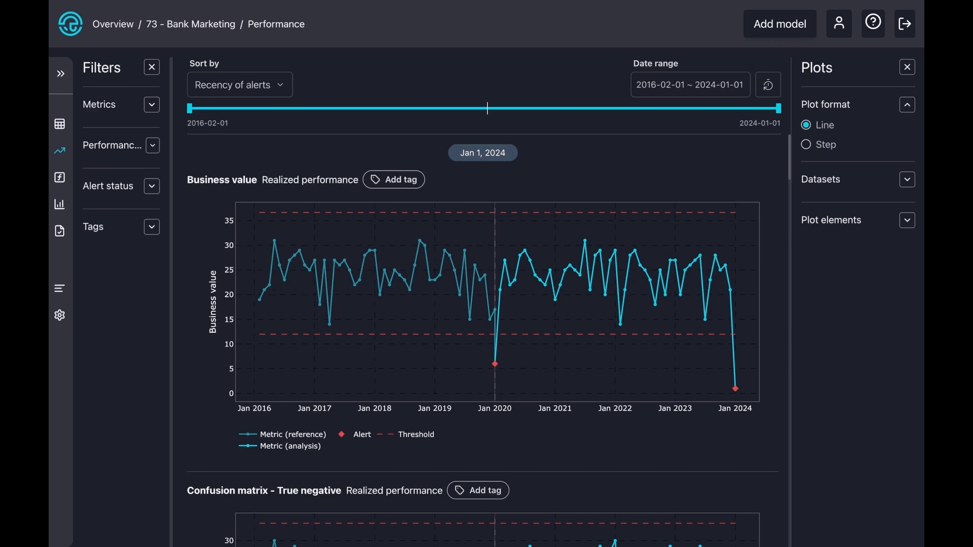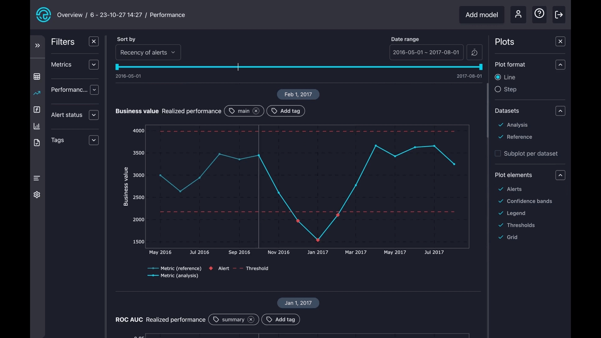 The Performance dashboard allows you to do an in-depth analysis of changes in model performance over time. If you prefer a video walkthrough, here is our guide explaining how to use the performance dashboard page: