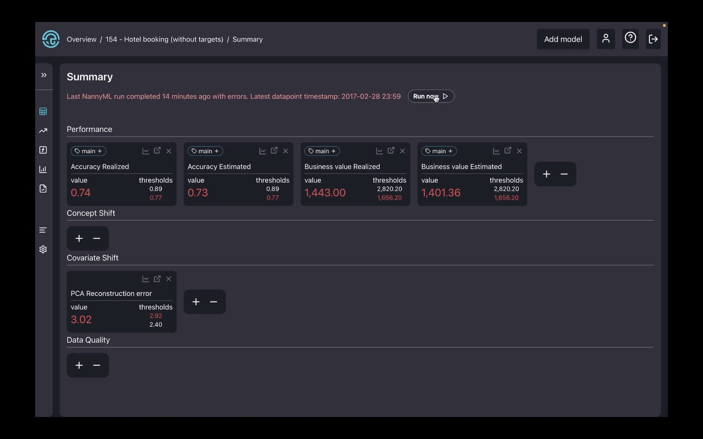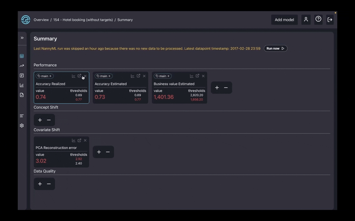 The first tab you can access in the side panel is the model summary page. It displays monitoring results for the most recent chunk for performance, concept shift, covariate shift, and data quality checks and notifies you whether there are any alerts.